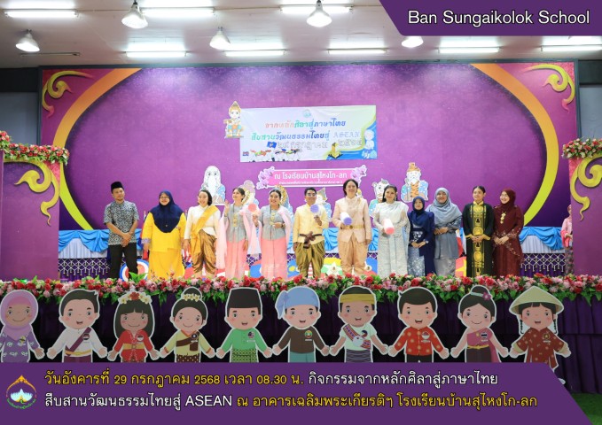 วันพฤหัสบดี ที่ 29 กรกฏาคม 2568 โรงเรียนบ้านสุไหงโก-ลก โดยนายชัยพล เพชรแก้ว ผู้อำนวยการโรงเรียนบ้านสุไหงโก-ลก เป็นประธานเปิดกิจกรรมจากหลักศิลาสู่ภาษาไทย สืบสานวัฒนธรรมไทยสู่ ASEAN