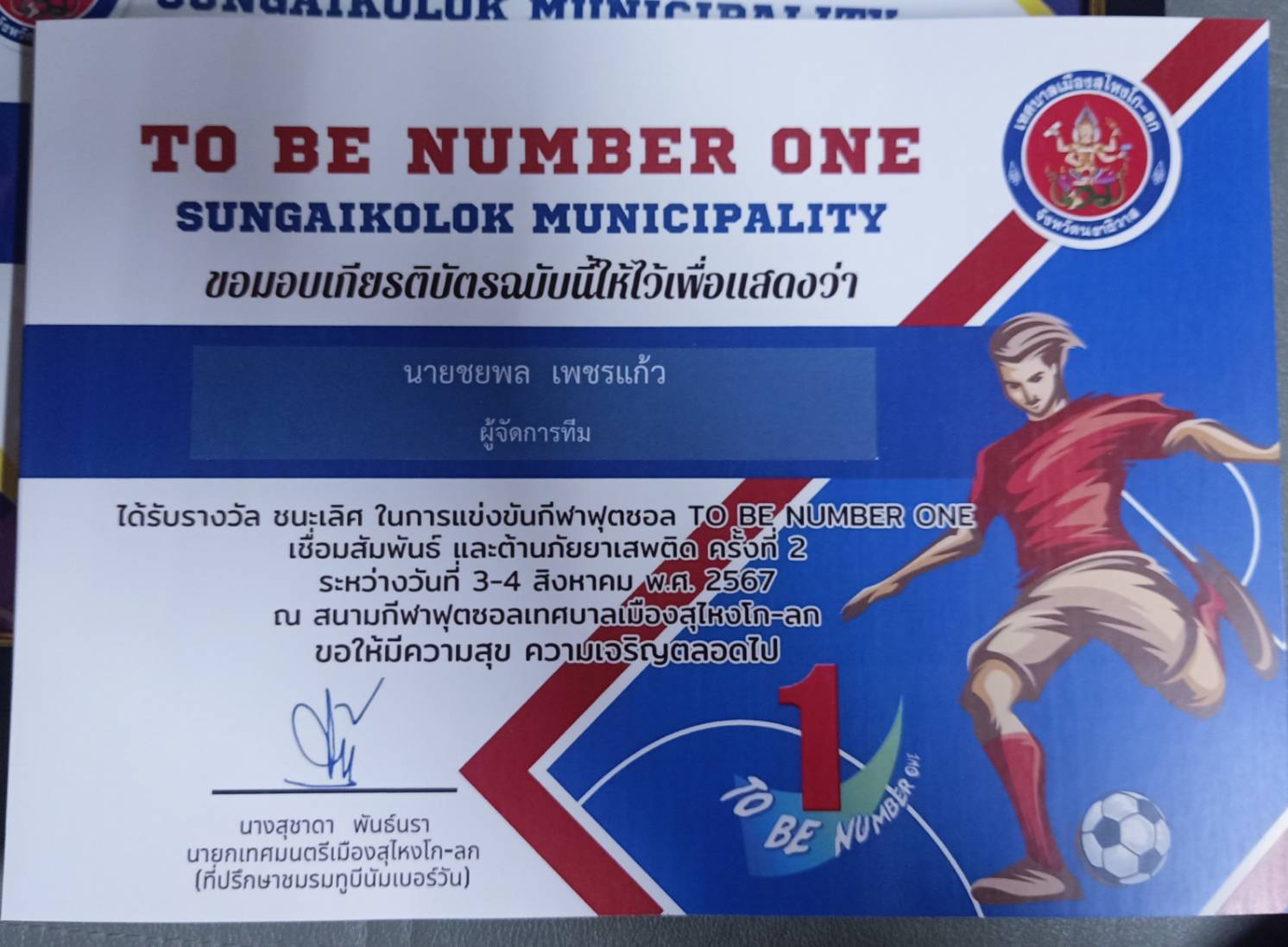 ระหว่างวันที่ 3-4 สิงหาคม 2567 นายชยพล เพชรแก้ว ผู้อำนวยการโรงเรียนบ้านสุไหงโก-ลก มอบหมายให้ นายสุชาติ มาสินธุ์ ครู โรงเรียนบ้านสุไหงโก-ลก นำนักเรียนเข้าร่วมการแข่งขันฟุตซอล TO BE NUMBER ONE