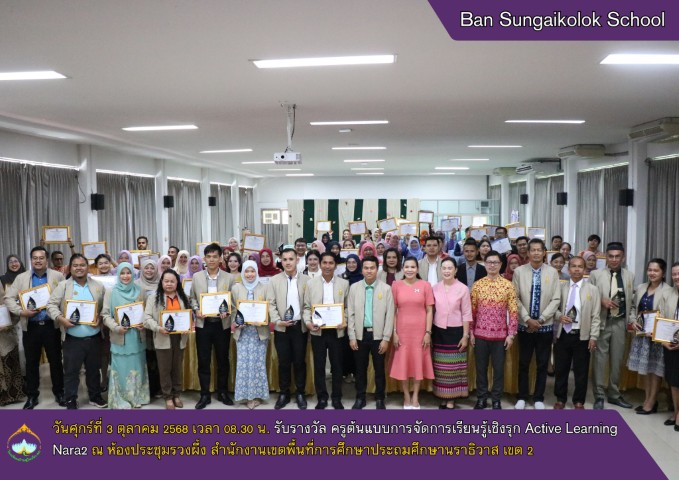 วันศุกร์ที่ 3 ตุลาคม 2568 เวลา 08.30 น. คณะครูโรงเรียนบ้านสุไหงโก-ลก สร้างความภาคภูมิใจให้กับโรงเรียนอีกครั้ง โดยเข้าร่วมพิธีรับมอบรางวัล "ครูต้นแบบการจัดการเรียนรู้เชิงรุก (Active Learning) Nara2" ณ ห้องประชุมรวงผึ้ง สำนักงานเขตพื้นที่การศึกษาประถมศึกษานราธิวาส เขต 2